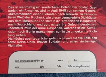 Locandina poster cinematografica realizzata nella Repubblica Democratica Tedesca (DDR) nel 1979 del film sovietico "Der Soldat und der Elefant" (Il soldato e l’elefante), commedia surreale prodotta dallo studio Armenfilm e diretta da Dmitri Kessajanz, con il celebre attore Frunse Mkrtchjan. Il manifesto, stampato in DDR da Progress Film-Verleih, l’ente statale della cinematografia della Germania Est, presenta lo stile grafico di quel periodo. Realizzato per fini promozionali destinata a circoli culturali, cinema o proiezioni scolastiche. La parte inferiore della locandina è volutamente lasciata in bianco, per permettere l’aggiunta a mano della data, dell'orario o del luogo della proiezione. La trama, come descritto nella locandina, è tanto assurda quanto affascinante. Di seguito la traduzione sommaria: "È davvero un ordine molto strano: il soldato Gasparjan, un armeno, nell’aprile del 1945 viene incaricato di trasportare un elefante fino a Erevan. Chi può sapere come questo pachiderma dello zoo di Mosca sia finito in Germania, nel mezzo dei combattimenti, anziché nella capitale armena. Gasparjan, mentre i suoi commilitoni marciano verso Berlino, deve procedere nella direzione opposta." La locandina è originale e non una ristampa. Molto rara e difficile da reperire. Al momento è tenuta distesa. Buone condizioni generali, potrebbe avere qualche lieve imperfezione date dal tempo, dall'uso e dalla conservazione (piccole lacerazioni ai bordi, qualche lieve fioritura etc.). Dimensioni: 57,5 x 41 cm (circa).
