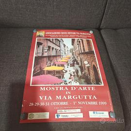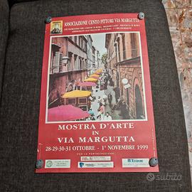 Locandina originale della Mostra d'Arte in Via Margutta tenutasi nell'ottobre/novembre 1999. Le prime mostre di strada in via Margutta risalgono al 1953, negli anni de La dolce vita ritratta da Federico Fellini nel suo film. Gli artisti appendevano i loro dipinti alle pareti e la strada appariva come un'immensa galleria d'arte all'aperto. Cento Pittori via Margutta è una organizzazione costituitasi come associazione culturale e storica di artisti pittori che espone principalmente a Roma, in Via Margutta, fondata nel 1970, le cui origini espositive risalgono all'ottobre del 1953. La locandina è in ottime condizioni estetiche. Presenta dei segni sul lato sinistro e si possono vedere nelle ultime due foto. - Dimensioni: 34*50cm circa - Anno 1999 - Patrocinata dal Comune di Roma, Regione Lazio e Provincia di Roma. - Organizzata dall'Assessorato alle Politiche Culturali - 1ª Circoscrizione. - Con la partecipazione di Credito Artigiano, Teorema Tre e Teodori.