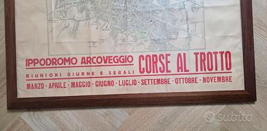 Locandina storica che pubblicizza le corse al trotto all'Ippodromo Arcoveggio di Bologna, con annessa una mappa della città del 1817.