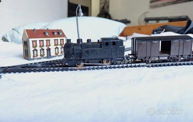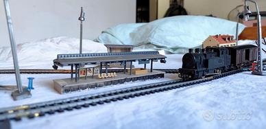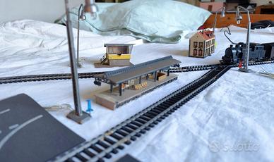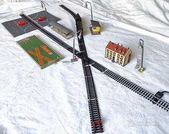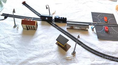 Parte di Circuito completo di binari e incrocio Lima con casette e stazione controllo , locomotiva inerente con Carro , lungo la tratta 4 lampioni , semaforo con controller , casetta per paesaggio con tappeto strada piu attacco controller Tutto funzionante , da allestire e terminare con comandi personalizzati . Il tutto comprende : 1 Locomotiva e carro con auto Curve medie 4 Lampioni . 1 Tappeto Strada 2 casette con pensilina Si dispone di video e altre foto del funzionamento locomotiva, un bel kit per iniziare.