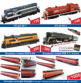 ATTENZIONE Ho tolto alcune immagini di locomotive che ho venduto e ne ho aggiunto un paio di nuovi modelli, una coppia di U50 e il convoglio Daylight. Locomotive americane di varie compagnie (Atlas, Kato, Athearn Genesis, Broadway Limited, Scaletrains, Life Like). Scala H0, corrente continua. Alcuni modelli sono solo analogici, altri digitali sound e altri ancora, grazie al controller DC MASTER, possono avere suoni vari anche su circuito analogico. Modelli nuovi, mai girato, con confezione originale e aggiuntivi ancora sigillati. I prezzi sono riportati su ogni modello Spese di spedizione comprese. Salvo errori ed omissioni (foto, descrizioni, prezzi). Per altre info e foto contattatemi. Grazie :) N.B.: - Modelli provenienti da mia collezione privata; - Dopo aver ricevuto il pagamento e prima della spedizione, il modello viene provato, fotografato e ripreso. Video e foto inviati poi all'acquirente; - Non si accetta reso per eventuale danni derivanti dal trasporto. - Non si accettano reclami e/o rimborsi per eventuale smarrimento del pacco da parte dei corrieri. Non sono responsabile del loro lavoro. Nel caso potete gestite voi la spedizione con eventuale assicurazione.