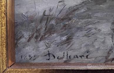 Lorenzo Delleani nato a Pollone nel 1840 è stato uno dei più importanti esponenti della pittura piemontese dell'ottocento. L'opera, olio su tavola, misura cm. 30x42, firma e data in basso a sinistra. Sul retro autentica di Leonardo Bistolfi e la provenienza dalla collezione di Carlo Follini. L'opera viene venduta con cornice in perfette condizioni e vetro museale, la misura dell'opera con cornice e di cm. 46x57.