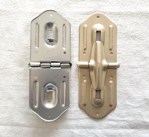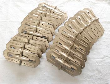 Lotto 10 cp coppie cerniere Vintage ricambio vecchi bauli. Tipo rigatino, con appoggio a 92°. Nuove e mai utilizzate. Scorte di magazzino da chiusura negozio. In buonissime condizioni. Normale usura del tempo. Posso fornire ulteriori foto o dettagli, a richiesta. Vendo solo in lotto e non singolarmente. Dimensioni cm. 14,8 x 5,3 (aperta). Prezzo NON trattabile. Già ribassato. Possibile il ritiro a mano.