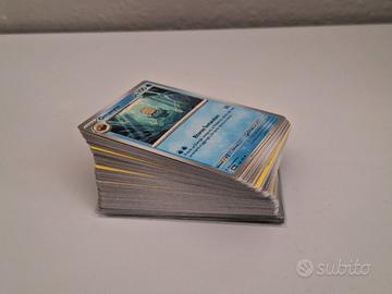 Lotto di 100 carte Pokemon da varie espansioni - per la maggior parte scarlatto e violetto - tutte in ottime condizioni senza energie. Il lotto comprende 4 carte reverse e 1 holo