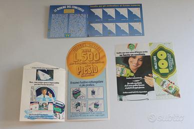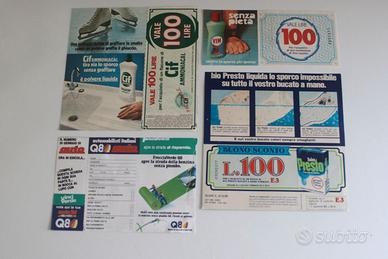 In questa inserzione propongo in lotto 10 buoni sconto, cartoline, raccolte punti ecc. cartacei legati al mondo delle riviste e prodotti pubblicitari del periodo, alcuni erano allegati al prodotto, altri nei mensili, quotidiani ecc. Sono 10 pezzi e di diversi marchi, quali VIM, CIF, BIO PRESTO, LUX, COCCOLINO, REXONA, SVELTO e Tv sorrisi e Canzoni "UN CHILO D'ORO", Q8 carburanti "Vinci verde alla Q8". Buone condizioni come da foto, articolo raro e pubblicitario fuori commercio e da collezione. Condizioni come da foto, visto e piaciuto. Non sono ritagli di pubblicità di riviste.
