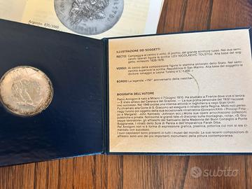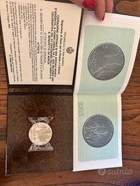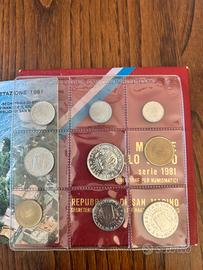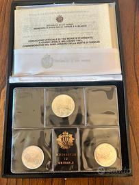 Splendida collezione di monete della Repubblica di San Marino, originale e completa di custodie e certificati di garanzia ufficiali. Tutte le monete sono in condizioni FDC (Fior di Conio) conservate nelle loro confezioni originali dell'Ufficio Numismatico. Il lotto comprende: 1. Serie Divisionale 1981: Set completo di 9 monete (dalle 1 lira alle 500 lire) in confezione originale rossa con libretto descrittivo. 2. Trittico in Argento 1981 - "Bimillenario della morte di Virgilio": Elegante cofanetto blu contenente 3 monete in argento (titolo 835/1000). 2 monete da 500 lire e 1 moneta da 1000 lire. 3. Moneta 1000 Lire Argento 1978 - "150° Anniversario Leone Tolstoj": Inclusa custodia a portafoglio blu e certificato (Autore: Pietro Annigoni). 4. Moneta 1000 Lire Argento 1980 - "XV Centenario San Benedetto da Norcia": Inclusa custodia a portafoglio marrone e certificato (Autore: Francesco Messina). 5. Moneta 1000 Lire Argento 1977 - "VI Centenario Brunelleschi": Inclusa custodia a portafoglio verde e certificato (Autore: Bino Bini).
