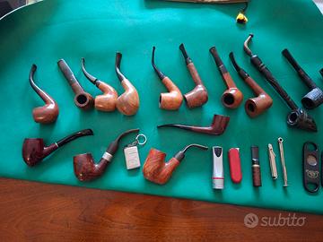 Vendo Lotto 15 pipe vintage con accessori come tagliasigari, accendini , ecc. Marche varie tra cui Moretti Recanati, Raganella ecc. Buono stato come da foto. Acquisto singolo a prezzo da concordare. Solo ritiro a mano , no spedizioni.