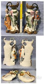 2) Coppia vestita da notte, entrambe le statuine hanno dei fori, in totale 4, sicuramente sono fori fatti al momento della cottura per evitare che l'oggetto si rompesse, ognuno all'altezza delle tempie e all'uomo forse manca qualcosa in mano, forse un bastone, un ombrello, misurano ambedue cm. 21. Sulla parte inferiore delle statue, in entrambe, vi sono delle scritte, così come da foto.