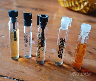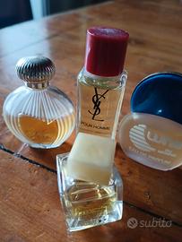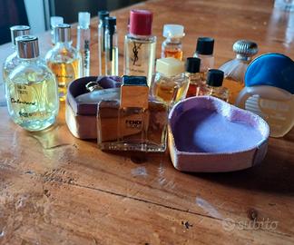 Fendi – 1 miniatura (EdT), flacone rettangolare vintage molto raro. Borsari 1870 – 1 miniatura in confezione originale a cuore con nappina rosa. Yves Saint Laurent (YSL) Pour Homme – 1 miniatura con tappo rosso. Chopard - Happy Diamonds – 2 miniature iconica con tappo dorato Chloe (Parfums Lagerfeld) – 1 miniatura vintage originale. Luna by Morris – 1 miniatura con tappo blu effetto marmo. Cabochard di Grès – 3 miniature (Eau de Toilette), flaconi uguali. - Nina (Eau de toilette) - Versace (Eau de parfum) - Olivier Strelli (After Shave) Fialette: - Versace Blonde - Brooksfield - Best Company - Erbolario Lodi - Aventure
