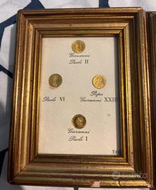 Quadro 2: 4 medaglie. Peso totale del quadro: 130 grammi. Cornici originali in legno dorato in ottime condizioni. Un set perfetto per collezionismo numismatico o religioso.