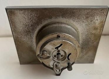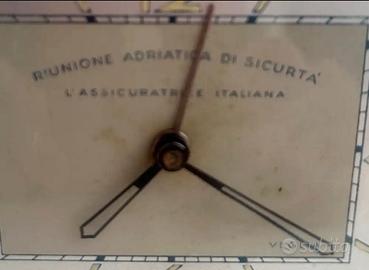 Sveglia con quadrante personalizzato "Riunione Adriatica di Sicurtà - L'Assicuratrice Italiana" cornice in metallo cromato con segni del tempo che ne esaltano il fascino retrò. NON testato il funzionamento, vendo come pezzo da collezione o elemento d'arredo