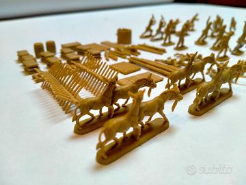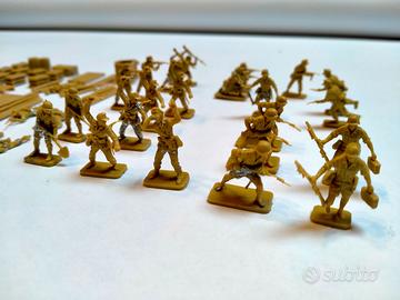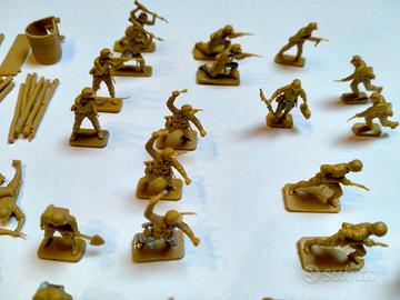 Vendo un set di soldatini vintage in plastica da 25 mm. Degli anni ‘70/’80 in varie pose con 4 muli, 2 bauli, 9 sacchi di sabbia, una scala, varie palizzate e 2 anti tank in buone condizioni conservative.