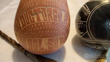 Mate tipica Argentina, vintage degli anni 70, facente parte di una collezione tazza ricavata dalle zucche e poi dipinte. originali marchiate industria Argentina. Tazze uso espositivo ,sono state usate molti anni fa e poi inutilizzate dispongo di 3 mate di cui 1 dipinta, una intagliata e una ricoperta con dedica e 2 bombilla, cannucce in metallo usate per bere il mate da queste particolari tazze.