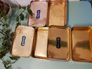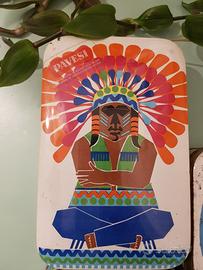 Tre scatole pubblicitarie originali in latta della storica azienda italiana Pavesi (biscotti “Biscottini di Novara”), risalente agli anni ’60. Le scatole con grafica diversa rappresentano indiano, lampada e mongolfiera.