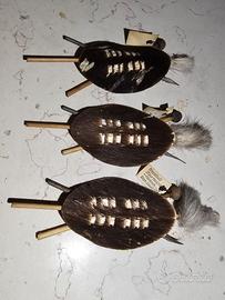 Vendo lotto composto da 3 scudi Zulu in miniatura, artigianato originale “Made in Zululand” come da cartellino. Realizzati con pelle, legno e dettagli decorativi. Ideali come oggetti da parete o decorazione etnica.