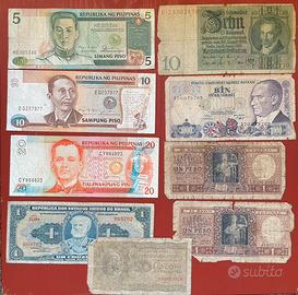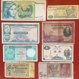 Lotto di 30 banconote mondiali. Include banconote da Spagna, Grecia, Germania, Egitto, Kenya, Thailandia, Yugoslavia, Hong Kong, Turchia, Giappone, Nepal, Filippine, Argentina, Brasile