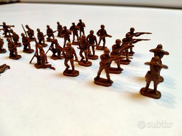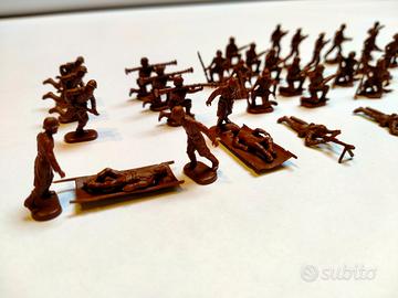 Vendo lotto di 36 soldatini vintage in plastica da 25mm. degli anni ‘70/’80 in discrete condizioni conservative con un raro set di 2 barelle per trasporto feriti.