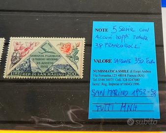 LOTTO 38 FRANCOBOLLI CON 5 SERIE DI SAN MARINO DAL 1952 AL 1958 (CON ALCUNI DOPPI). TUTTI PERFETTI MNH. VALORE CATALOGO SASSONE 350 EURO. COME DA FOTO, ALTO VALORE.