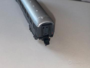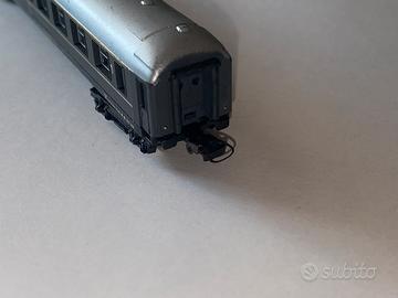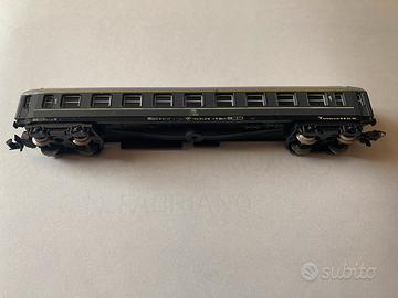Lotto 4 carrozze passeggeri e carro postale ardesia scala N 1:160 trenino Lima usato in buone condizioni, segni del tempo, segnalo un respingente rotto in una carrozza passeggeri.
