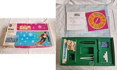 - Slalom – Editoys – il tabellone è diviso a metà ma non pregiudica il gioco; a 2 degli 8 cartoncini che rappresentano gli sciatori manca una linguetta per l’inserimento negli sci, e uno dei due cartoncini è anche diviso a metà (vedi foto); coperchio della scatola in mediocre condizioni.