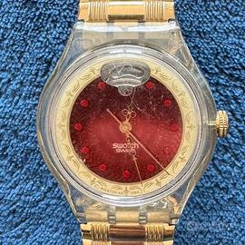 • Swatch Automatico: Quadrante bordeaux, finiture oro e cinturino elastico. Movimento meccanico a vista sul retro da 23 rubini.
