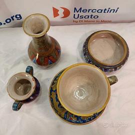 Tazza con piatto, ciotola, vasetto e una piccola anfora.