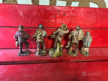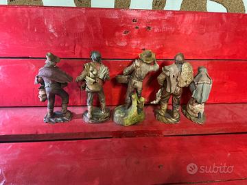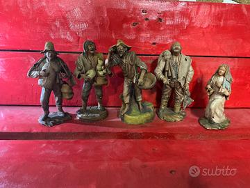Firmate Pippo giovane Per veri appassionati e collezionisti dell'arte presepiale napoletana, propongo un magnifico lotto di 5 statuette artigianali. Tutte le figure portano sotto la base il timbro originale di Pippo Giovane, noto e apprezzato maestro presepista contemporaneo, a garanzia della qualità e della fattura artistica. Il lotto è composto da 5 pastori con "mestieri" e pose diverse, perfetti per dare vita e realismo alla scena del presepe: Pastore con caciocavalli (Pippo giovane - come già identificato) Pastore con lanterna e bastone Zampognaro/Pastore con otre Pastore con fiasche Figura femminile (probabilmente una popolana/pastorella)