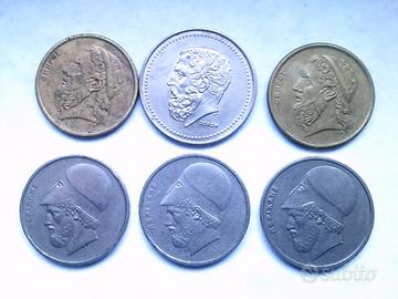 lotto 6 monete greche: 20 dracme del 1976(due) e 1978,50 dracme del 1984,1988,1990. Le monete sono tutte in buone condizioni come da foto possibilità di consegna a mano per residenti di Napoli o provincia per altre destinazioni spedizione postale posta1,costo 3 euro a parte,prezzo non trattabile