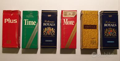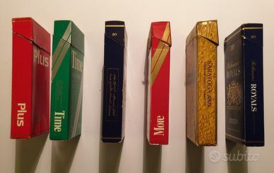 Lotto di 6 rari pacchetti VUOTI di sigarette rigidi Vintage da collezione, formato 120S. In ottime condizioni come da foto.