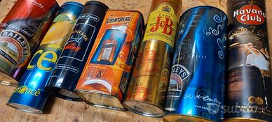 Lotto INDIVISIBILE di 7 scatole in latta, tubolari e per bottiglie liquori vintage. PREZZO A LOTTO RIBASSATISSIMO!