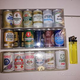 Lotto di 13 set da 6pz Alpa Miniature (più piccoli dei normali mignon) contenenti acqua già in origine; le bottiglie sono in vetro e le lattine in metallo.