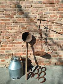 Lotto Antichi Utensili Contadini composto da - bidone per latte in alluminio con coperchio - bilancia stadera - mestolo latte caseario ferro legno intagliato a mano - ferri da cavallo