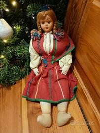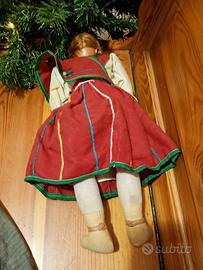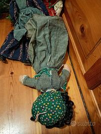 Una bambola capelli neri , vestito sui toni del grigio , grembiule e cuffia verdi con fiorellini , corpo imbottito, testa in plastica
