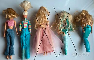 Barbie vendibili sia singolarmente che in lotto. LOTTO COMPLETO: 24 € Prezzo Barbie sirena + Barbie con top rosa e Denim: 10 € l'una poiché sirena con coda mancante e l'altra Barbie con testa spezzata. Barbie salopette azzurra: 12 € poiché pantalone macchiato