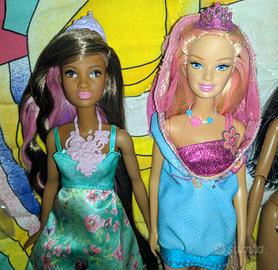 Barbie dreamtopia color stylin è nuova, con tutti i suoi accessori. Girando lo scalpo i capelli diventano rosa e con un accessorio-spugnetta cambiano pure colore. Barbie merliah è nuova con outfit completo, anche a lei i capelli diventano rosa credo col caldo. La made to move è ottima per il corpo, il viso ha degli aloni rosa. Nikki fashion Fever rock star è in buonissime condizioni ma ha delle macchiette rosa sul retro delle gambe