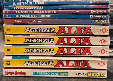 Il lotto include: • Agenzia Alfa: Numeri 1, 4, 8, 10 (Albi giganti con storie complete). • Dampyr: Numeri 2 e 57. • Brendon: Numeri 7 e 9. • Crossover Speciale: Nathan Never & Martin Mystère "Il segreto di Altrove". • Legs Weaver: Speciale n. 2 "Le Paladine".