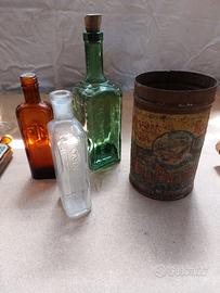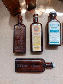 Bottiglie per farmaci e liquori, ancora con etichette originali conservate epoca. Alcune presentano marchio fabbrica appartenenza in rilievo sulla stampa della bottiglia.