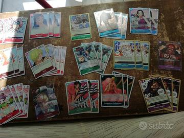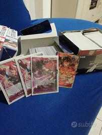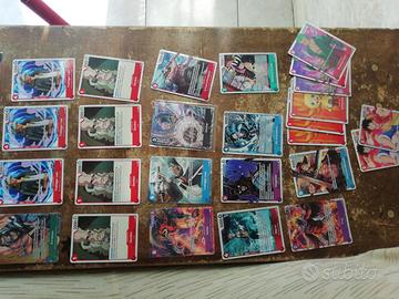 Vendo maxi lotto di carte one piece op01 op02 op03 condizioni mint, ce ne sono di molto rare e sono tutte in foto( luffy r, kaido, kid, borsalino, drake, ecc..) più tre starter deck mai usati, più tutte le altre in foto nel box.