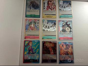 Lotto unico di carte One Piece Card Game in lingua giapponese, come da foto. Inclusi personaggi iconici (Ace, King, Marco, Chopper, Charlotte, ecc.) tra character, event e leader, con diverse rarità e artwork alternativi. Ideale per collezionisti, giocatori o per arricchire il binder. Carte conservate con cura, non giocate, riposte subito in sleeve.