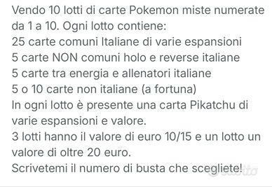 Vendo numero 10 lotti composti da circa 40 carte comuni e non come meglio descritto in foto. Ad oggi il lotto n. 2 e 6 è gia stato venduto. Vari Pigatchu vi aspettano, Buona fortuna