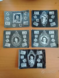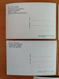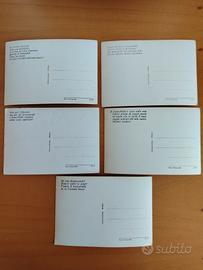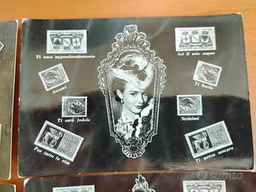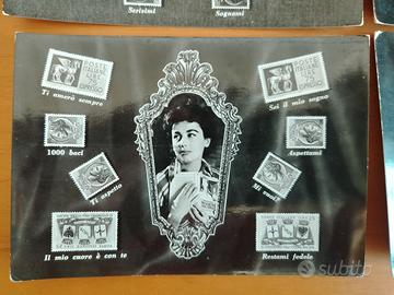 N°5 cartoline italiane della serie" Il linguaggio dei francobolli "anni'60. Decorate con ritratti femminili in stile cinematografico, circondati da francobolli commemorativi abbinati a romantiche frasi. Il francobollo usato per la spedizione indicava un diverso messaggio