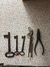 Lotto composto da chiavi antiche di grandi dimensioni e utensili da lavoro d’epoca, realizzati interamente in ferro.