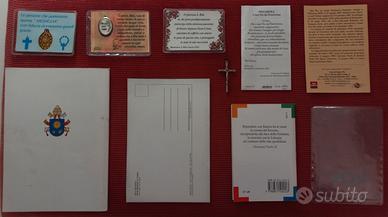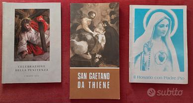 Questo vasto assortimento comprende, ad esempio, preghiere e medagliette di Santa Rita (tutto perfettamente custodito), santini del Santo Padre Pio, Padre Mariano, una piccola croce, preghiere di rosari di Padre Pio e celebrazione della penitenza, una piccola collezione di biglietti della METREBUS ROMA raffiguranti vari Papi importanti ed un preziosissimo articolo del 1997 (L'Osservatore Romano) che ci parla del cinquecentennale della morte di San Gaetano.