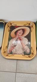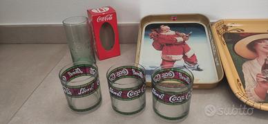 Lotto Coca Cola composto da tre vassoi in metallo, tre bicchieri bassi e un bicchiere alto con scatola, una fascetta da capelli con elastico. Tutto il materiale è ben conservato.