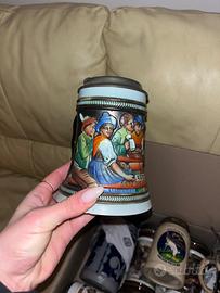 Importante lotto di boccali da birra in ceramica smaltata, stile bavarese/tedesco, con coperchi in peltro lavorato. Decorazioni in rilievo policromo, scene tradizionali, manifattura di qualità. Produzione vintage da collezione (circa anni ’60–’80).