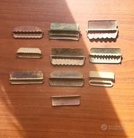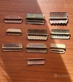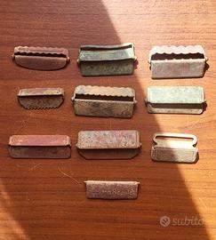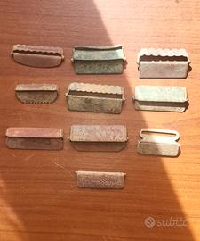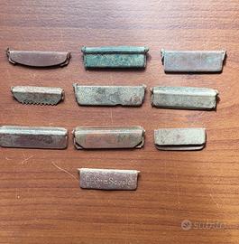 Il lotto comprende 10 fibie di diverso tipo e colore, quella più in basso di tutte presenta una scritta però è l'unica a cui manca l'aggancio di chiusura.