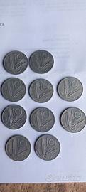 Occasione imperdibile per collezionisti: lotto di 10 storiche monete da 10 Lire 'Spighe' del ricercatissimo anno 1954, ben conservate e pronte a impreziosire la tua collezione.