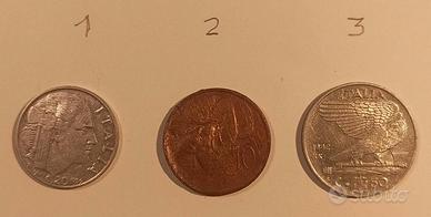 Lotto di 3 monete italiane d'epoca del fascismo coniate durante il regno di Vittorio Emanuele III.