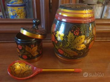 oggetti in legno laccati e dipinti a mano dell'URSS - vintage - 2 Barattoli con coperchio di vari dimensioni + 1 cucchiaio
