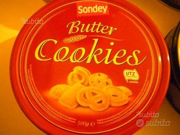 Lotto di quattro scatole di latta vuote Danish butter cookies (biscotti danesi al burro) in eccellenti condizioni.